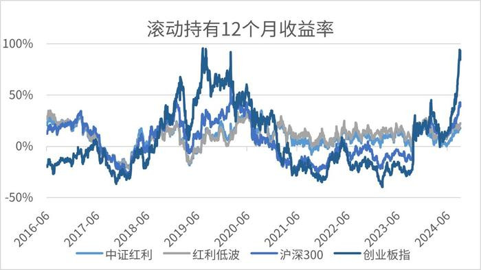 甚至在市场估值明显抬升后,定投红利的收益在长期看更优于成长类指数,以2014年6月至2016年6月的市场周期为例,红利定投的优势比创业板更加显著。例如2014年12月起定投,中证红利、红利低波的收益分别为4.61%、5.82%,优于创业板指的4.00%和沪深300的2.80%,这本质是红利因为本身具备较强的低估值属性,长期来看受估值波动影响较小所致。